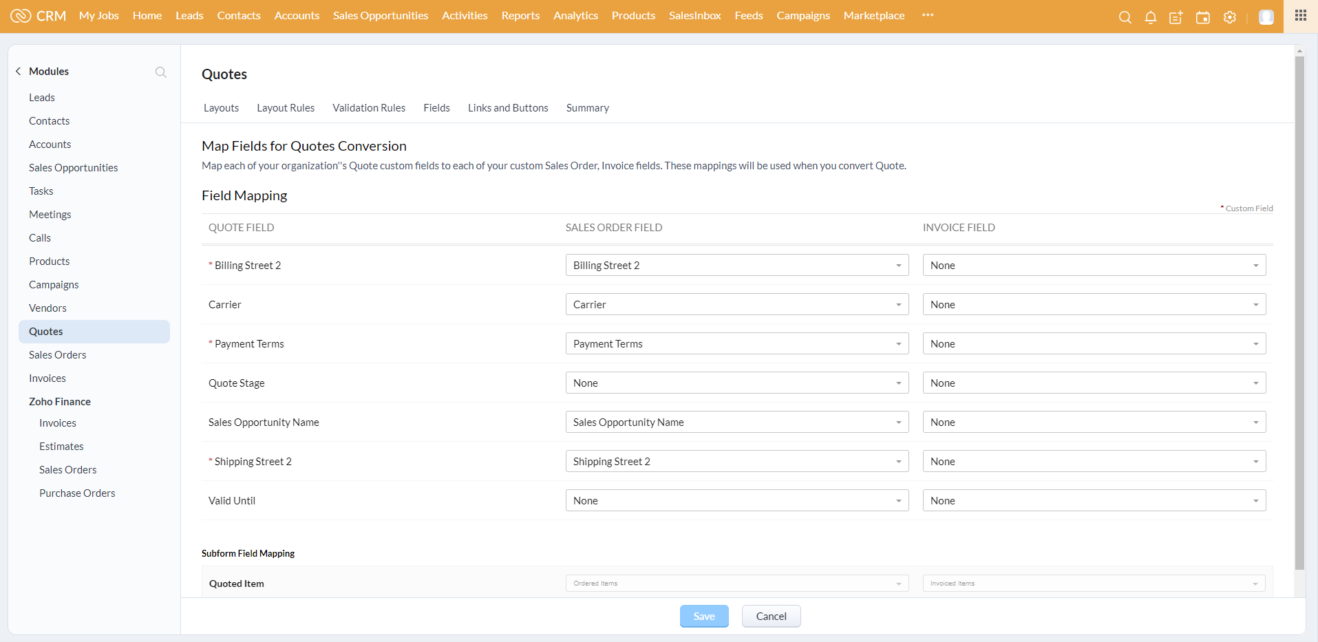 I wanted to map a billing street 2 and shipping street 2 from the Account module to the Quote module, then on convert, to map these to the Sales Order in CRM. As my client's sales team would only create sales orders in CRM and don't use the invoice module (that's for their finance team using ZohoBooks), we disabled the CRM Invoice module.