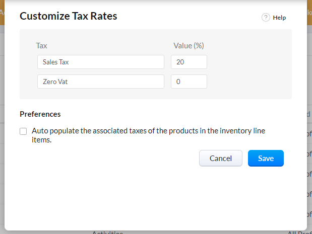 - If you do not do the second section as per this article, even having customized the tax rates, when selecting a product that has no tax rates against it and clicking on the edit icon for Tax at the line item level (at header level is unaffected and all tax rates are selectable: in the aggregate fields section), the user will get a popup saying something like "No tax associated with this product.".