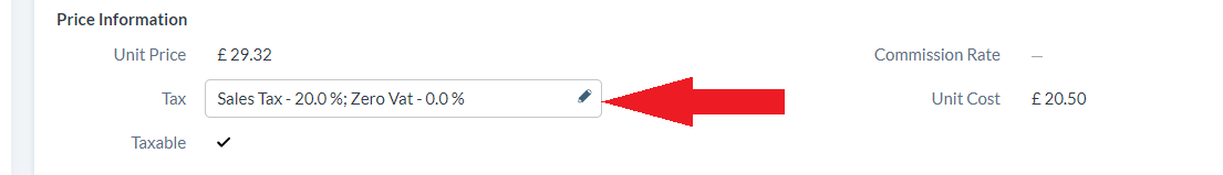 - Under Price Information, edit the field "Tax" (multi-select) and select both tax rates