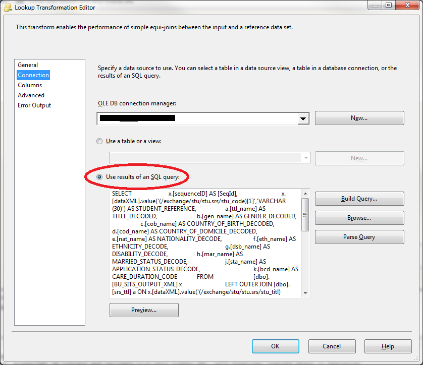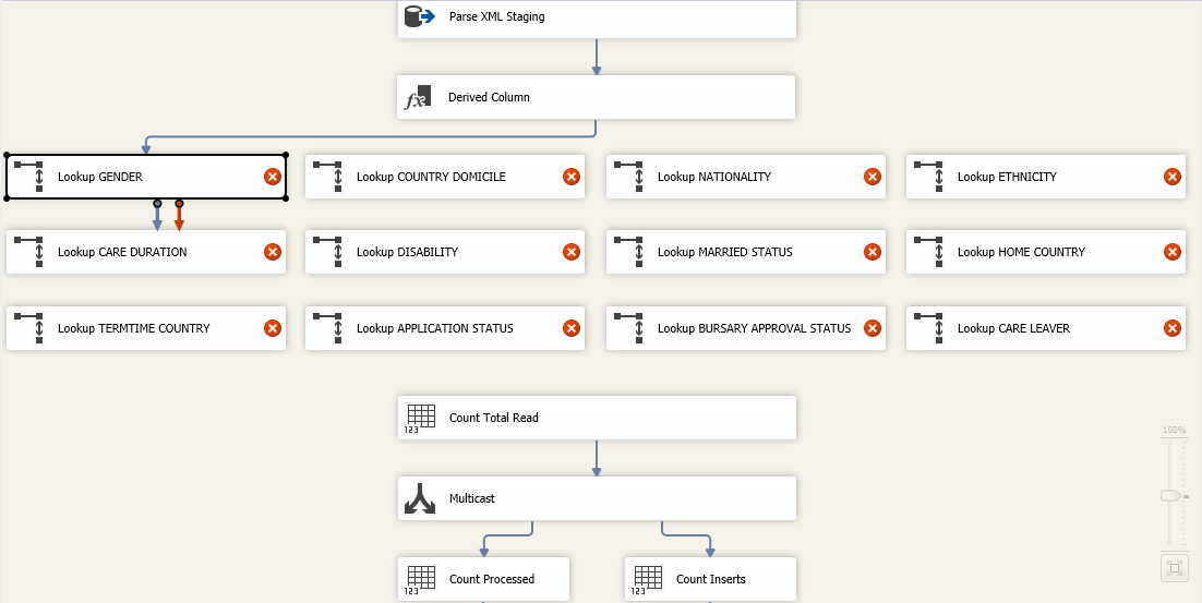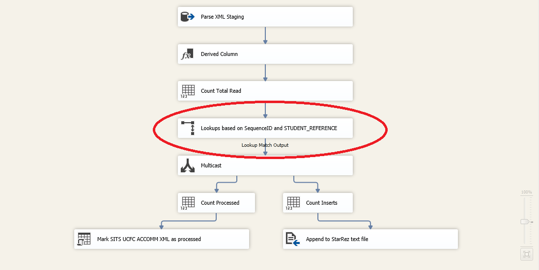 Which would code with the joined tables as follows (note that in our case we needed the lookups on the source database which was not the same as our staging one which this package gets as its source):