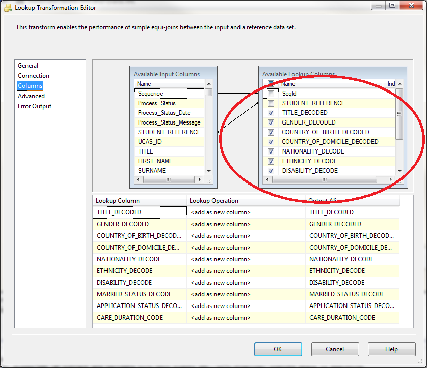 Note this also allows NULLs so, our sequence identifier and student reference are never blank so it is safe to to use "Lookup Match Output" as rows with neither sequence nor student reference will not come through the system. Lookups that failed will return as NULL. Selecting the fields to output into the data-flow: