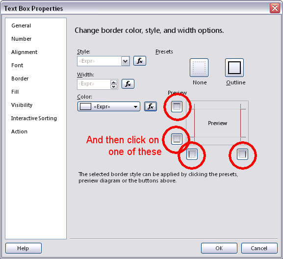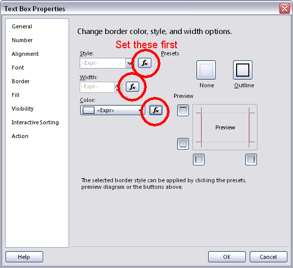 Another thing is that it isn't obvious if the border settings have saved. Usually if you just click on the border buttons it will remember what style you specified originally but it doesn't display what this style is (whether expressions or colors).