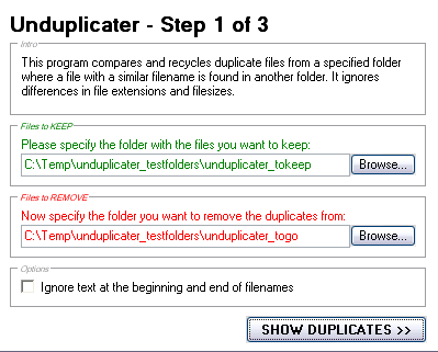 If you need to remove files which are simply the converted versions of music or video files, then this tool asks which folder has the files it will keep and which ones it will send to the Recycle Bin.